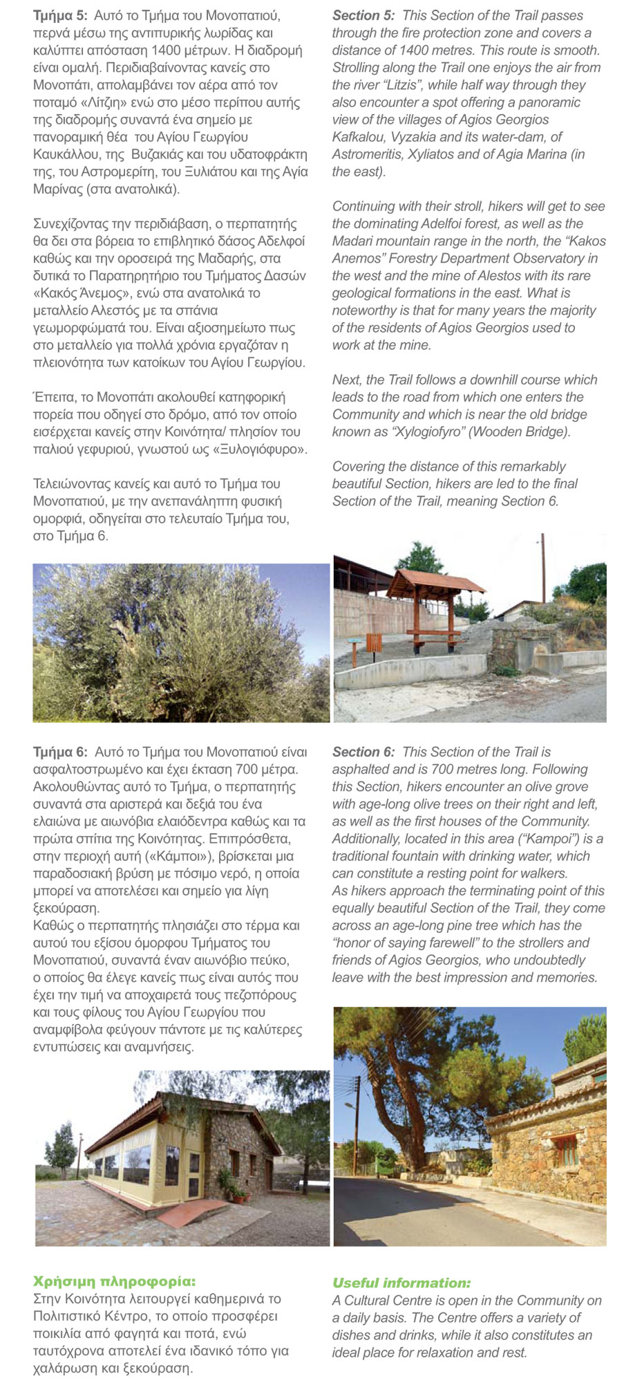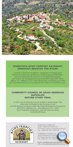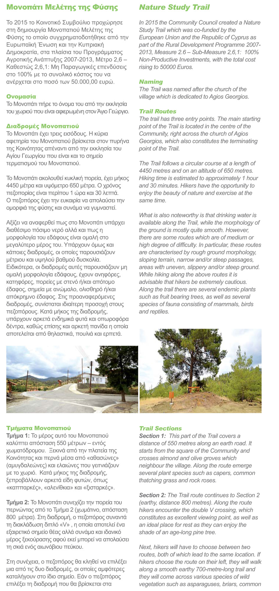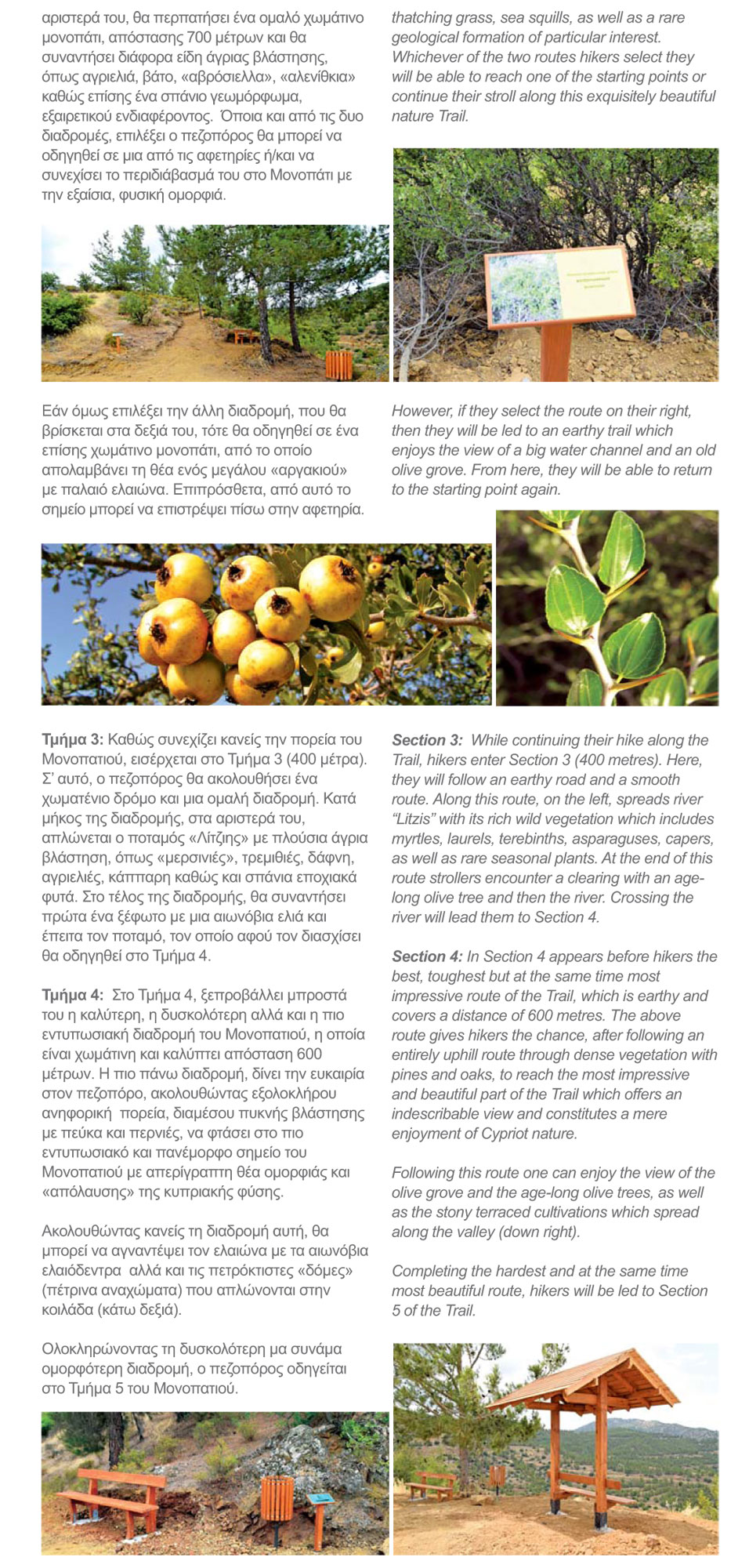 Περπατώντας κανείς το Μονοπάτι της Φύσης έχει την ευκαιρία να απολαύσει τα όμορφα χρώματα και μυρωδιές της φύσης. Κατά μήκος του Μονοπατιού θα συναντήσετε διάφορα είδη άγριων φυτών, ελιές, μορφιλιές, περνιές, αμπέλια, πεύκους. Τα είδη πανίδας που ζουν στην περιοχή είναι: λαγός, πέρδικα, ποντικός, μαύρο φίδι, έχιδνα και «κουρκουτάς».